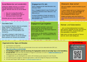 Ihr könnt euer persönliches Programm zusammen stellen und aus 15 kostenfreien Workshops eure Themen auswählen – flexibel, passgenau und praxisnah. Die Workshops decken die ganze Bandbreite der Vereinsarbeit und des Ehrenamts ab: rechtliche Grundlagen, Finanzierung und Fördermöglichkeiten, Mitgliedergewinnung, Öffentlichkeitsarbeit, Zusammenarbeit im Verein und vieles mehr.