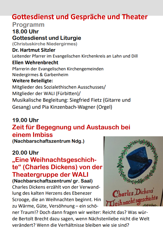 Ab 20 Uhr präsentiert die Theatergruppe der WALI im großen Saal des NBZ das Stück „Eine Weihnachtsgeschichte“ nach Charles Dickens.