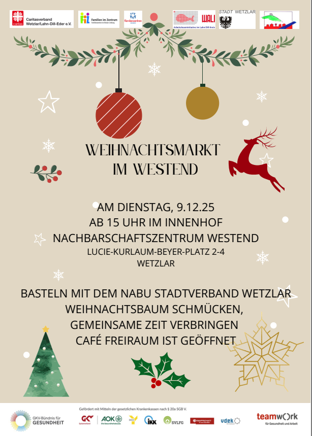 Am Dienstag, den 9. Dezember 2025, verwandelt sich der Innenhof des Nachbarschaftszentrums Westend ab 15 Uhr in einen warmen, festlichen Treffpunkt für alle Nachbarinnen und Nachbarn.