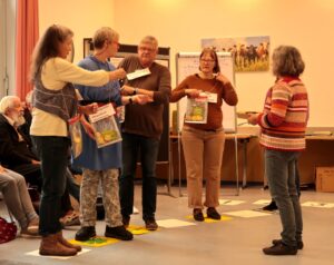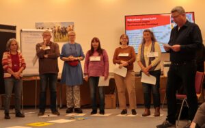 Zum Abschluss wurde die Rallye im Rahmen einer Präsentation am letzten Seminartag vor Presse und Gästen aufgeführt und zur Diskussion gestellt. Richard Kunkel, katholische Betriebsseelsorge Oberhessen, eröffnete mit einem Grußwort die Präsentation. Unter dem Motto „Herbst der Gegenwehr – Sozialabbau verhindern!“ veranstaltete das bundesweite Bündnis „AufRecht bestehen“ (https://www.erwerbslos.de/) eine bundesweite dezentrale Aktionswoche vom 20. bis zum 24. Oktober 2025. Mit unserer öffentlichen Präsentation des Spiels am 23.10. leisteten wir einen Beitrag dazu.