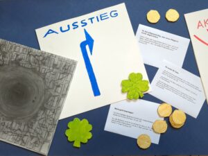 Das Spiel macht erfahrbar, wie es ist, wenn dadurch Reiche immer reicher, Arme immer ärmer werden. Aber es gibt auch Glückspunkte zu gewinnen, zum Beispiel wenn Vermögen aufgeteilt wird oder jemand einem anderen hilft. Und es gibt auch eine Ausstiegsmöglichkeit: die Rentner*innen-Wohngemeinschaft, das Aussteigerdorf oder das Café-Kollektiv, die die Figuren an bestimmten Punkten wählen können.