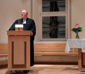 Superintendent Dr. Hartmut Sitzler predigte über Matthäus 10: „Ich sende euch wie Schafe mitten unter die Wölfe.“ Er zeigte auf, wie aktuell Bonhoeffers Haltung und geistliche Klarheit bis heute bleiben.
