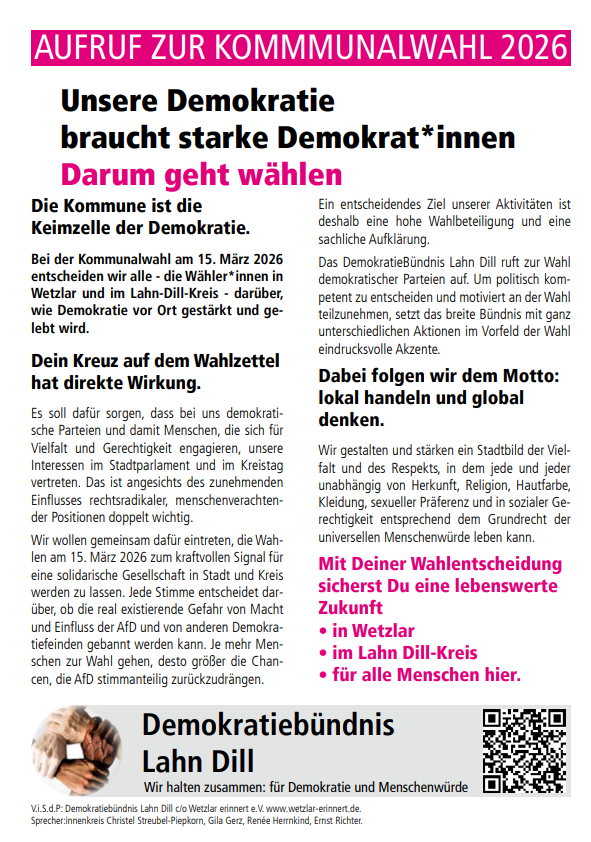 Unter dem Motto: Die Kommune ist die Keimzelle der Demokratie ruft das Demokratiebündnis Lahn Dill die Menschen auf: