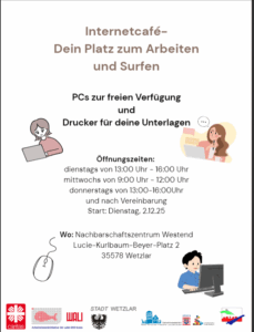 Ob E-Mails schreiben, online Formulare ausfüllen, Bewerbungen erstellen, Behördentermine buchen oder einfach surfen – das Internetcafé bietet kostenlosen Zugang, technische Hilfe und eine freundliche Begleitung.
