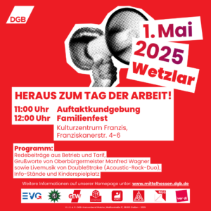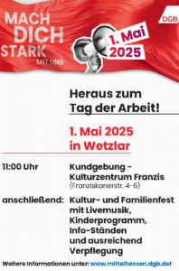 Wir würden uns freuen, wenn wir uns am ersten Mai vor dem Wetzlarer Franzis treffen. Kommt vorbei und zeigt eure Solidarität und euer politisches Engagement, um ein Zeichen zu setzen für einen starken Sozialstaat.
