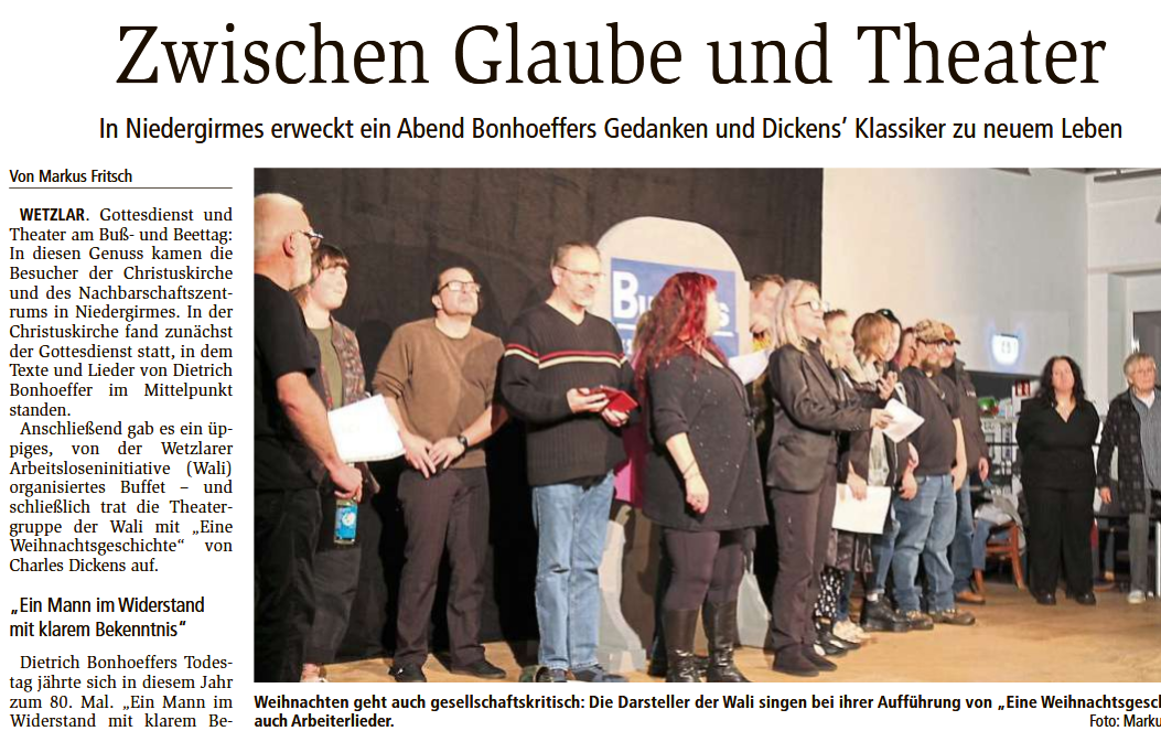 Gottesdienst und Theater am Buß- und Beettag: In diesen Genuss kamen die Besucher der Christuskirche und des Nachbarschaftszentrums in Niedergirmes. In der Christuskirche fand zunächst der Gottesdienst statt, in dem Texte und Lieder von Dietrich Bonhoeffer im Mittelpunkt standen.
