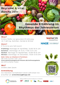 Die Online-Reihe heißt „Regional und vital durchs Jahr – Gesunde Ernährung im Rhythmus der Jahreszeiten“. Sie umfasst pro Jahreszeit jeweils drei Online-Termine und vermittelt praxisnahe Informationen, alltagstaugliche Tipps sowie Anregungen für eine ausgewogenen, regionale und saisonale Ernährung. Jede Jahreszeit bringt neue Impulse für eine gesunde und genussvolle Ernährung.